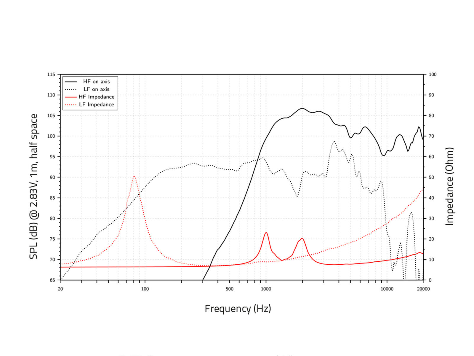 200 W AES LF/35 W AES HF, 4 ohms LF/4 ohms HF, 96 dB LF/103.5 dB HF, 75-5500 Hz LF/1500-20000 Hz HF