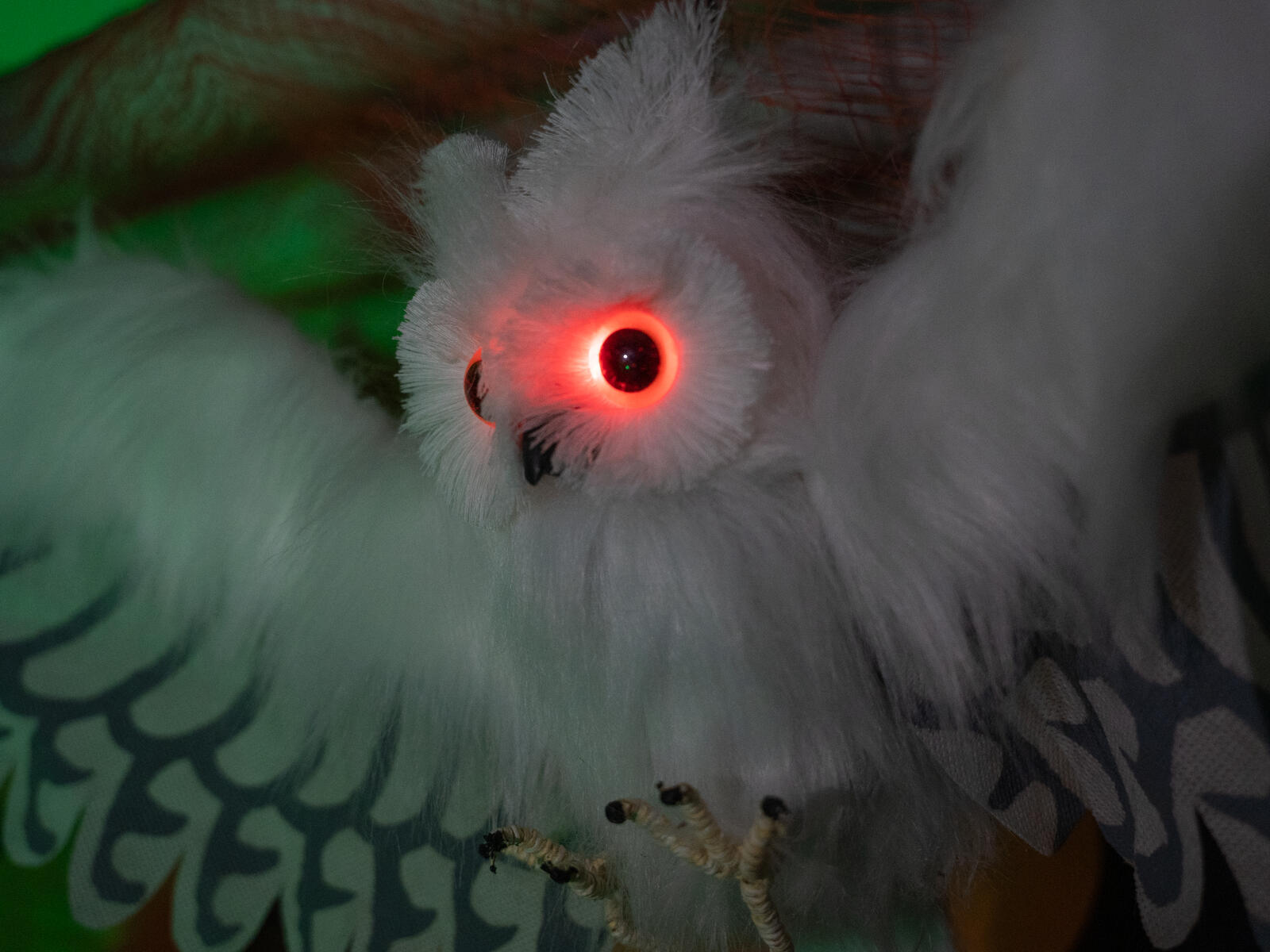 Chouette blanche animée, effets lumineux et sonores, capable de mouvement